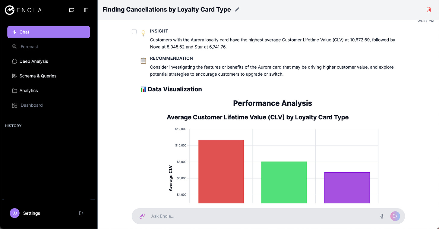 Validation: Within hours, Enola confirmed the strongest drivers of cancellation: mid-salary Aurora members traveling without companions. It also rejected red herrings like points redemption, which many had assumed to be the culprit.